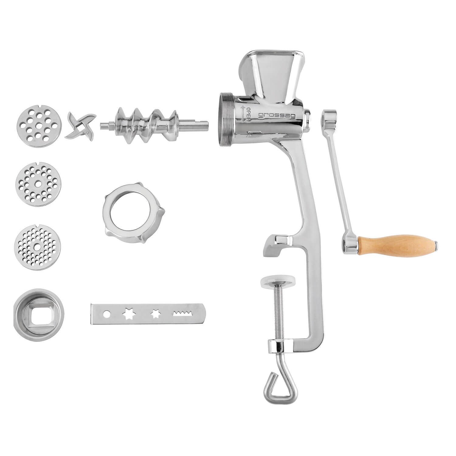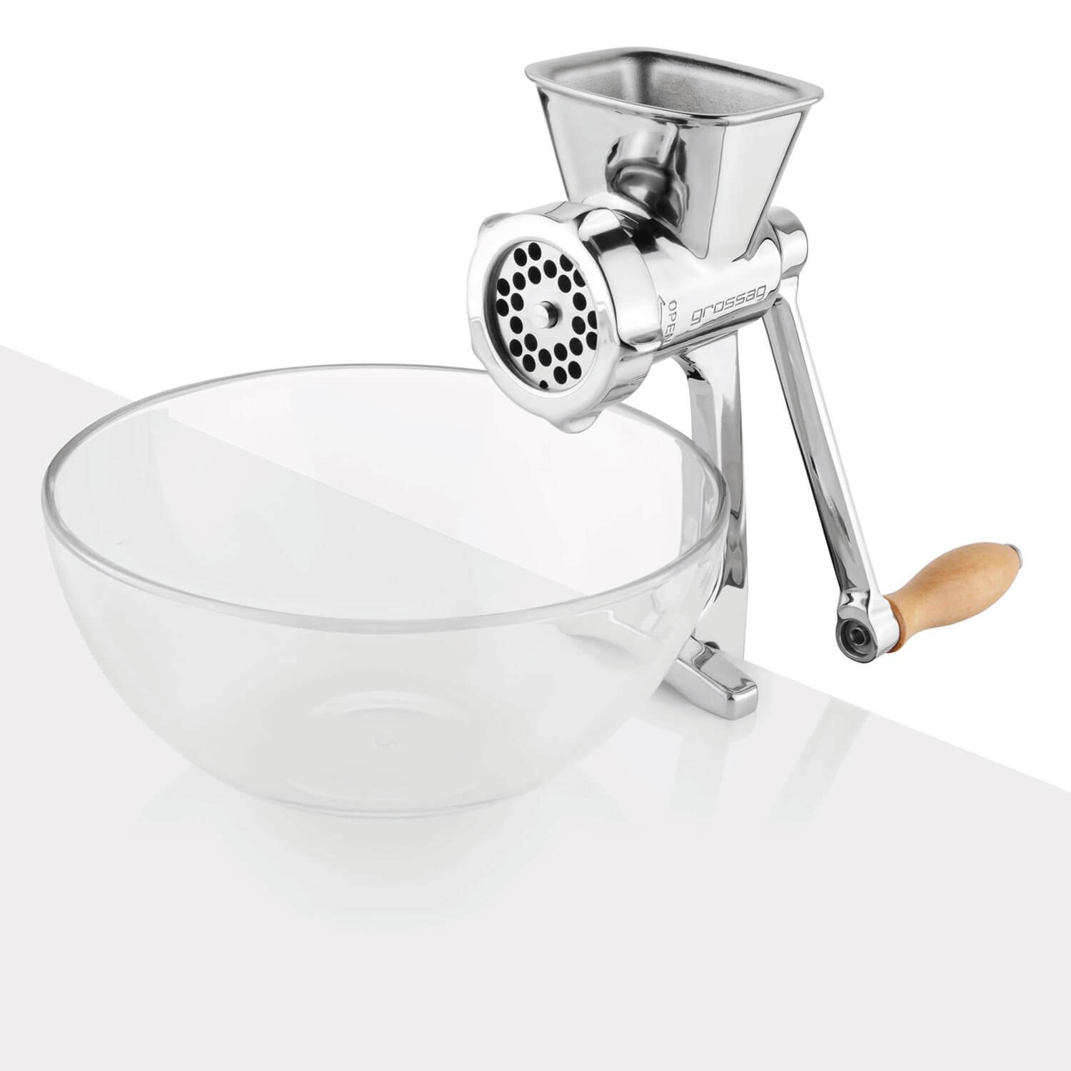 Mit seiner praktischen Unterstellhöhe und der einrastenden Kurbel bietet der GROSSAG Universalwolf ein Benutzererlebnis, das störende Unterbrechungen vergessen macht. Das handpolierte Edelstahlgehäuse nicht nur ein Blickfang, sondern auch spülmaschinenfest – für eine einfache Reinigung.Details, die zählen