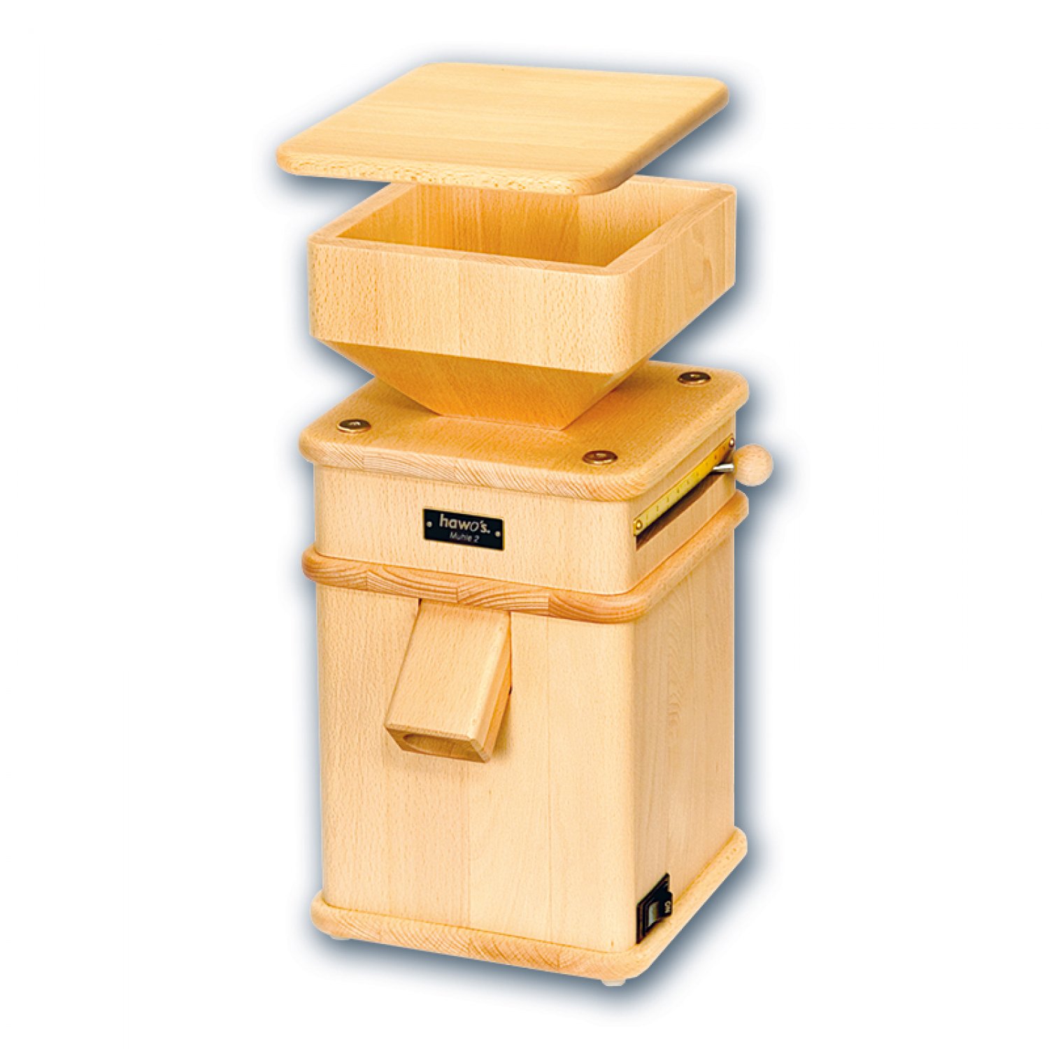 Das Gehäuse der hawos Mühle 2 wird aus massivem Buchenholz gefertigt und in vielen Arbeitsschritten perfektioniert. Die lebendige Maserung des Holzes wird durch eine Behandlung mit Leinölfirnis betont, wodurch die Mühle nicht nur robust, sondern auch ein optisches Highlight in jeder Küche ist. Die klare, zeitlose Formensprache macht die Mühle zu einem wahren Designklassiker.